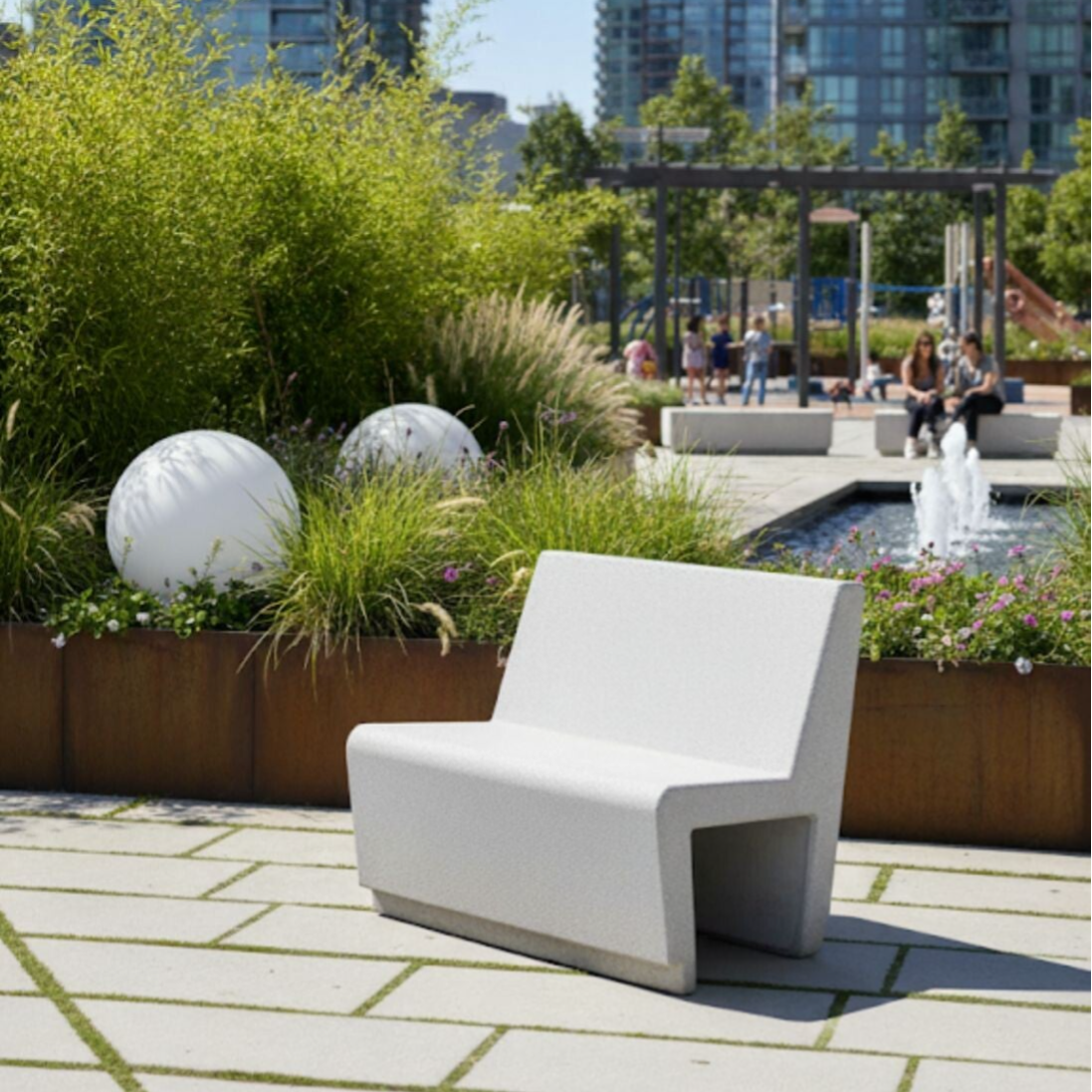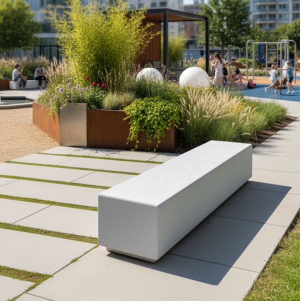 Bancas prefabricado hecha a base de concreto armado f'c 200kg/cm2 hecho a base de cemento blanco, 1% color según se indique, con capa de hidrofugante y sellador acrílico mate, ideales para parques o jardines